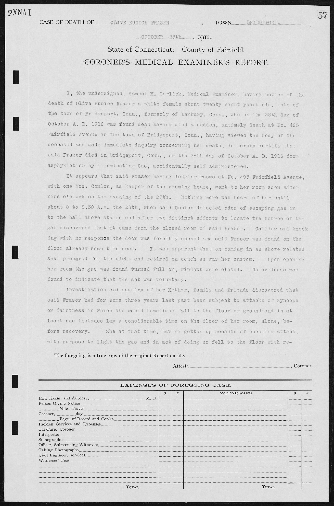 The above is the medical examiner’s report for the death of Olive Eunice Fraser. Of course, the medical examiner wouldn’t be the one who decided whether or not this was a suicide or murder or an accidental death these days. In 1916 however, it seems this document is telling us this death was an accident. Even though this is true, I would have to think the news of how this 28-year-old girl died would really rock her friends and family, especially her parents.