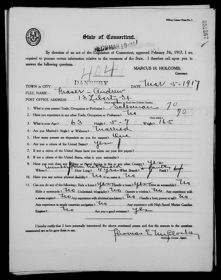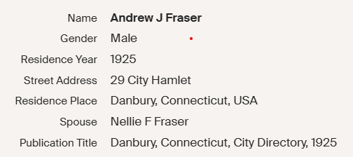 In all the censuses he filled out, his occupation was consistent, James Irving Fraser was always a painter, house painter or painting contractor. He did move around a little bit with one of his addresses being “Beaver Brook District.” None of his addresses were in the lower rent areas of Danbury. It seemed like he was a good provider.