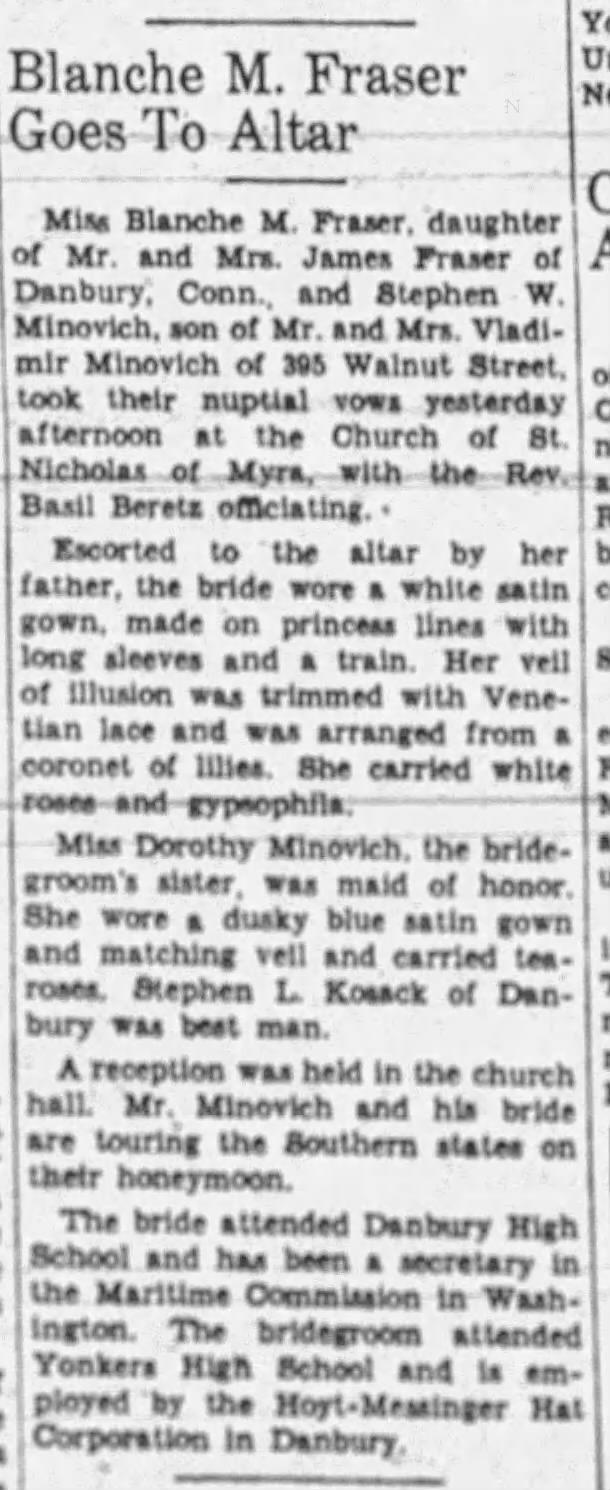 Blanch Fraser Minovich Wedding 9-9-1940 The Herald Statesman (Yonkers, NY)