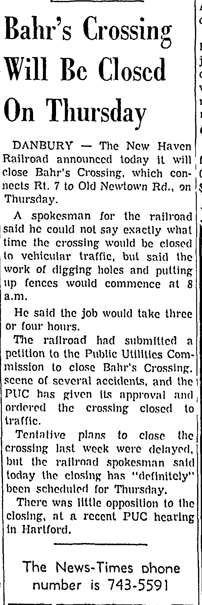 Where this occurred was Bahr’s crossing, not Barr’s Crossing. Bahr’s crossing was a railroad crossing that connected Beaver Brook Rd with Route 7. If you were driving down Route 7 from Brookfield, the crossing was just past where Mitchell’s is now. I have ridden through this crossing with my father driving many times. I asked AI when it closed and it answered 1994. This is definitely a wrong answer. If I was on Who Wants to Be a Millionaire and “What year did Bahr’s Crossing close?” was the last question for a million dollars and I had no life lines, my answer would be 1965. I would have lost everything but I would be much closer than AI is. The article below is from Tuesday, February 12, 1963.