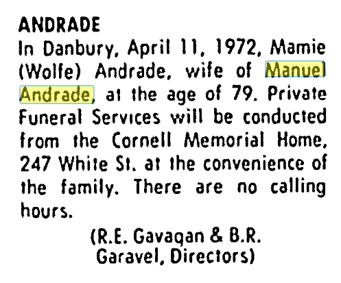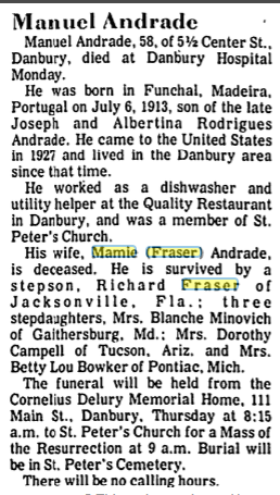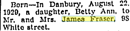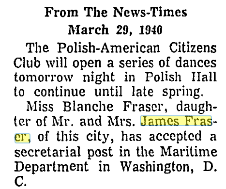 Though she was married in Yonkers in 1938, Blanche Myrtle Fraser (31 May 1917 -Danbury, Fairfield County, Connecticut – March 1980 – Silver Springs, Montgomery County, Maryland) moved back to Danbury for a short time then moved to Maryland where she and her husband lived out their years.