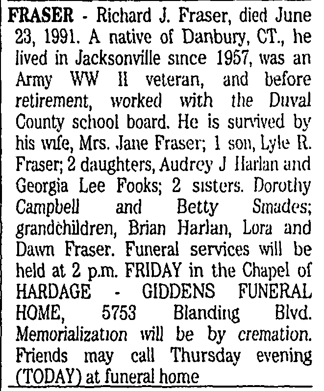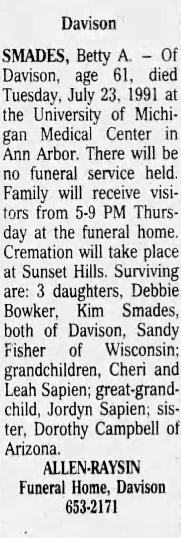You will notice the Fraser sister, Betty is Smades in this obituary but she was married several times. Her name was Smades 1991. Actually, Betty died one month after this obituary.