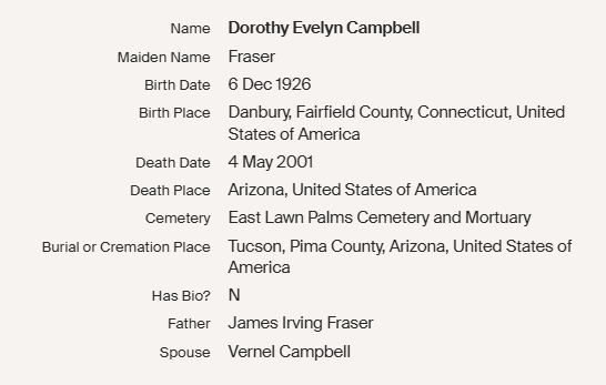 After Dorothy Evelyn Fraser Campbell died, Vernal Campbell married Doris Bond and she was still alive when he Passed away in 2012. Vernal, who was originally from Kentucky has been known in his retirement years as Sgt. Vernal Campbell, and is buried with his first wife, Dorothy Evelyn Fraser Campbell under that name.