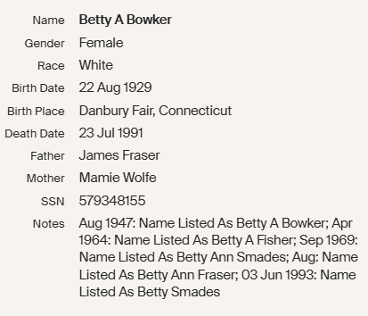 Aug 1947: Name Listed As Betty A Bowker; Apr 1964: Name Listed As Betty A Fisher; Sep 1969: Name Listed As Betty Ann Smades; Aug: Name Listed As Betty Ann Fraser; 03 Jun 1993: Name Listed As Betty Smades”