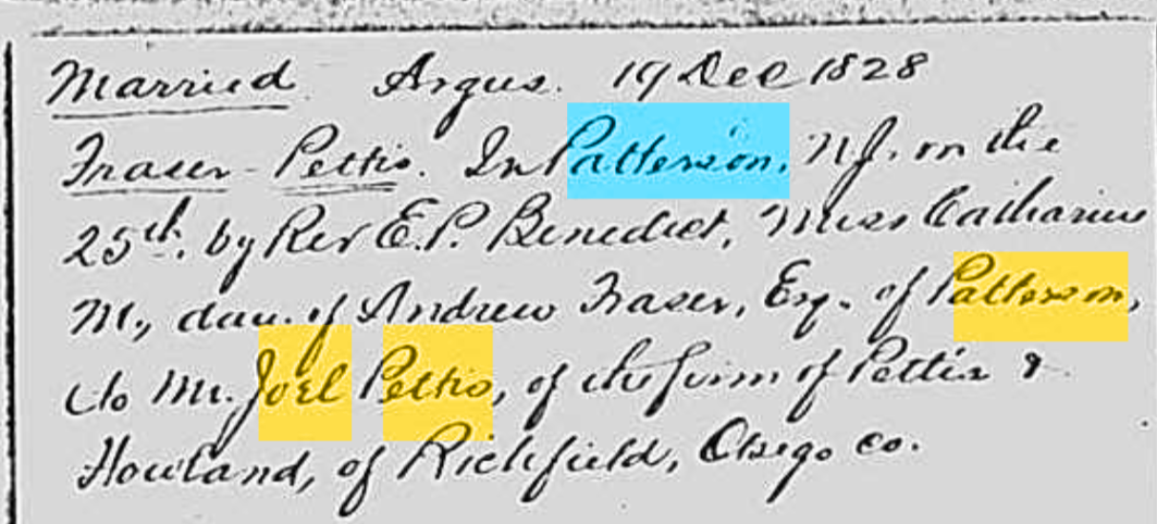 Joel and Catherine Fraser Pettis, Harvey and Jane Fraser Crosby as well as Andrew and Grace Ann Fraser are all buried in The Presbyterian Churchyard on Maple Ave in Patterson. This is the same cemetery in which Olive Eastwood’s parents, John and Ann Ludington Eastwood are buried. Col Henry Ludington and Sybil Ludington of Revolutionary War fame are buried in very close proximity to them as well.