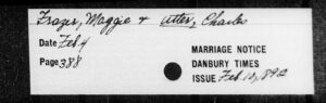 Maggie and Charles were married on or about February, 10, 1892, This is when the Danbury News Times published their marriage notice. This document below, tells us the date the New Times received the request to publish the article. (Feb 4) It also tells us the date of the issue the notice would be published in. This would be the Feb 10 issue. In 1892, The Danbury News Times published a paper every day except Sundays. In 1892, February 10 was a Wednesday. This document is not a recognized genealogical document, such as a marriage certificate, but obviously, the date of the issue of the newspaper the marriage notice is published in will always be close to the wedding date.