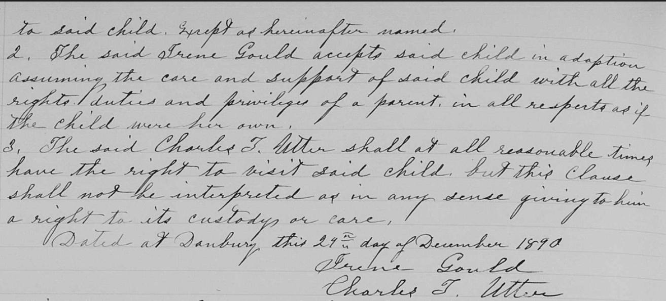 On December 29, 1890, Charles Utter and the late Eliza Gould Utter’s sister Irene entered into a legal agreement that let Irene adopt Ida with Charles getting full visitation rights. This was convenient because Charles and Irene both lived in Danbury.