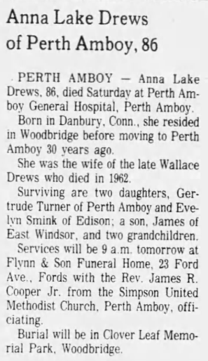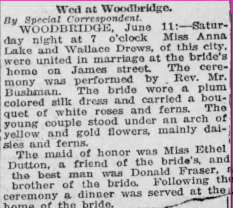 My best guess is Joseph sent them away with his best wishes in mind. Annie was a seamstress by trade and seemed to be doing alright. There is no doubt this move worked out well for her. She soon got married in Woodbridge to a man named Wallace Drews and the wedding took place in “her house!” This has the sound of opulence. She named her son after her step brother James and even though the newspaper article about the wedding referred to him as Donald, this has the sound of love. Also, even after she was married, James Donald and Anna May still lived in Annie’s house. This has the sound of one big, a happy family! Annie Lake Drews was married on June 6, 1919. She died May 8, 1978.