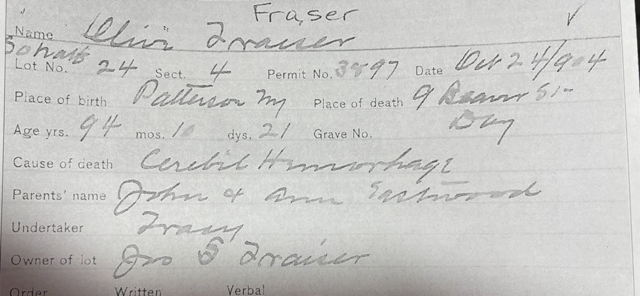 JD was married in Patterson to Olive Eastwood in probably 1850 or a bit before. They had four children all in Patterson. One of these children, of course, was Flora Fraser, Percy Barrett’s mom.