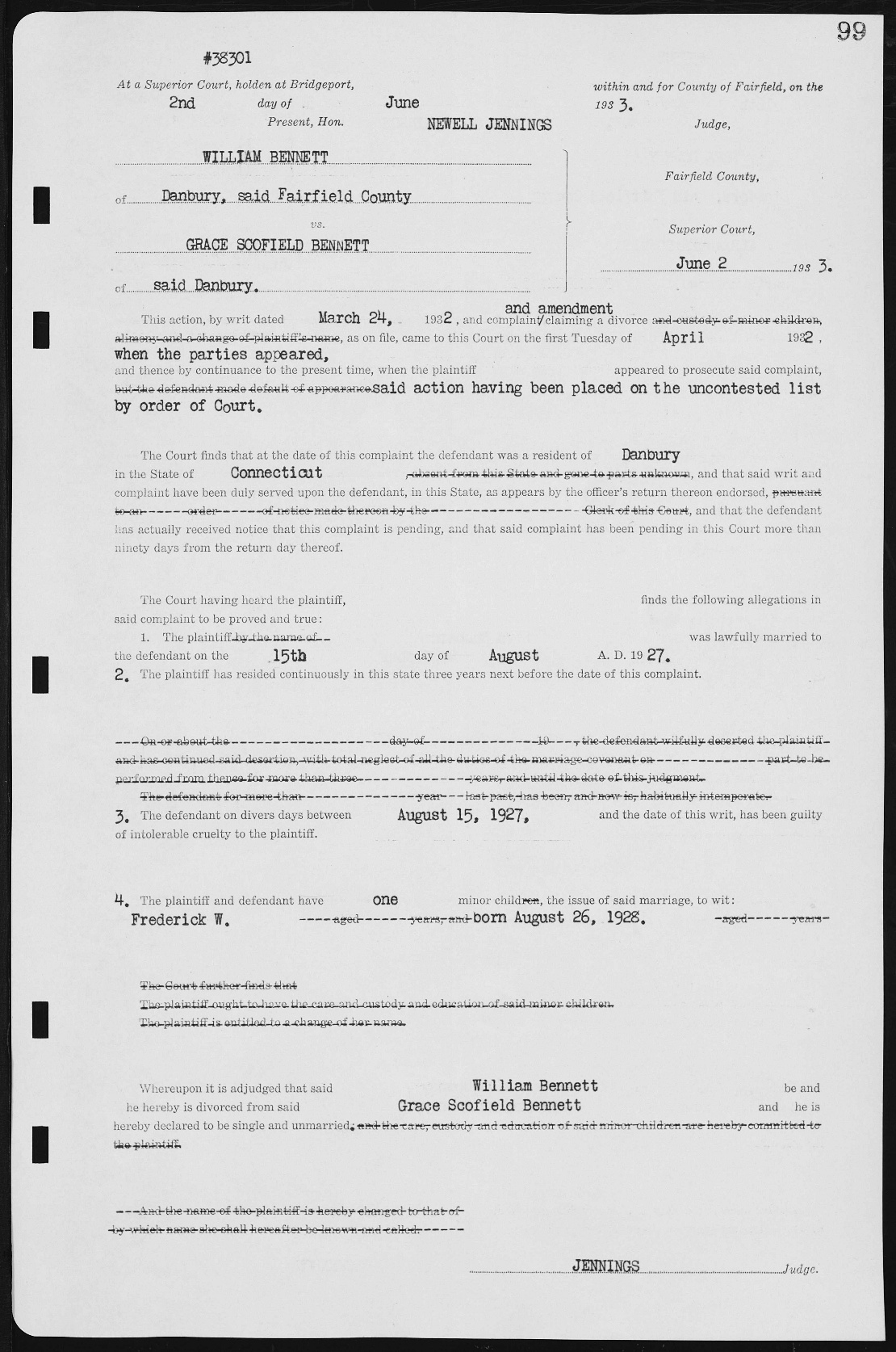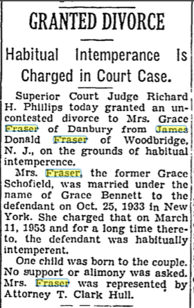 James Donald Fraser was born on June 6, 1899 in Danbury hospital. His parents were Joseph S and Anna May Burns Lake Fraser. We have the birth record showing all his birth information. However, when he filled out his draft card, he stated he was born on June 6, 1900. He moved, with his mother and step sister, Annie Lake when he was 18 to Woodbridge, Middlesex County, New Jersey. It looks like he never saw his father again after that. At least, the two never lived in the same town again and after he died, Joseph S.’s dead body was sent to “friends” to be laid to rest. He was married on June 23, 1920 in Woodbridge, NJ to Emma Eisenhauer. Emma was born in Germany in 1898. The two had two children together, Howard J and Helen M Fraser. Emma passed away in, we believe 1933. She was 35. Though we don’t have a death date of Emma’s passing, we do have a record of her being alive in some part of 1933. Before the end of 1933, James Donald was married to Grace Elizabeth Scofield Bennett. Grace was divorced on June 3, 1933 from William Frederick Bennett and it was Mr. Bennett who sued for the divorce.