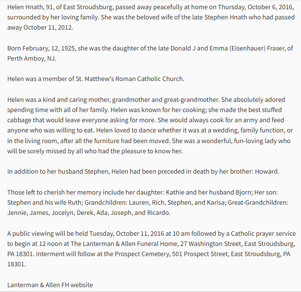 Helen married a man named Stephen Hnath. She was born in 1925 and didn’t die until 2016. By all accounts she was a wonderful person, had a wonderful marriage and a wonderful life. She left behind many children, grandchildren and great-grandchildren. Her obituary is below. It is copied from the Findagrave.com website. Helen was my mother’s second cousin. Howard J Fraser who, of course, was also my mother’s 2nd cousin, was a World War II Veteran and an auto mechanic.