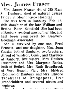 Also included in the Donald Fraser/Grace Elizabeth Scofield Bennett Fraser household were Frederick, who was a son of the Grace Scofield/ William Bennett marriage and Joan Delores Fraser, who was the daughter Grace and Donald. Joan would marry Edward Czajka of Danbury. The two lived for many years on State St in Danbury.