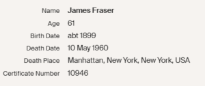 He does have some sort of a death record showing the year he died, which was 1960. This small clip below is it. It is from Manhattan in 1960, showing him to have died that year in the 5th month and 10th day. He was 61. This is true as we know from his birth record, he was born in 1899.