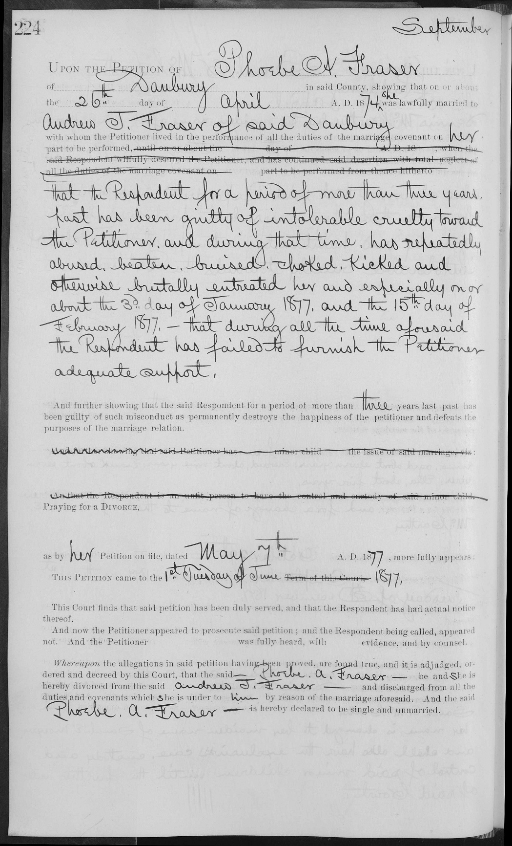 Obviously, Andrew J Fraser was named after his grandfather, Andrew. There are no childhood records of Andrew J Fraser, but he was married in Danbury, Ct in 1874 to Phoebe A, and she divorced him in 1877. We do not know Phoebe A’s maiden name. We will keep looking for it but for the time being we’ll just assume she was from the Danbury area. The more immediate point though is she divorced Andrew J after about three years of far less than matrimonial bliss.