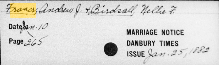 Around January 25, 1882, Andrew J Fraser and Helen “Nellie” Birdsall were married. I say about January 25th because the record I have only tells us the date of the Danbury News Times issue in which the marriage notice was published. This was the January 25, 1882 issue. January 25th 1882 was a Wednesday. Still, this could be their wedding date because I asked AI if people got married on weekdays before the year 1900 and it told me they did! It even said Tuesdays, Wednesdays and Thursdays were very popular wedding days.