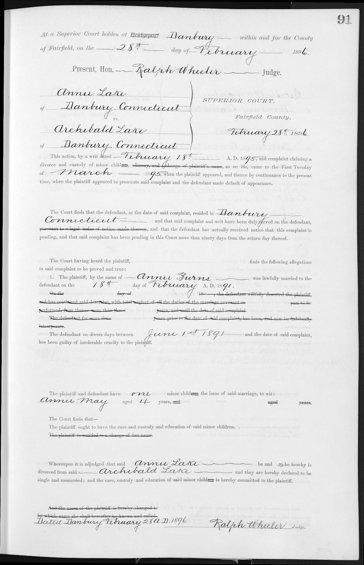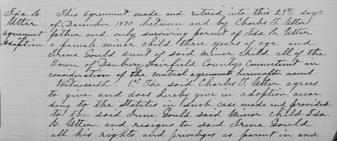 On December 29, 1890, Charles Utter and the late Eliza Gould Utter’s sister Irene entered into a legal agreement that let Irene adopt Ida with Charles getting full visitation rights. This was convenient because Charles and Irene both lived in Danbury.