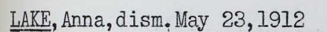 Annie Lake was born in Danbury on February 9, 1892 to Anna May Burns and Archie Lake. Therefore, she is not a blood relative of mine but she was a very interesting part of the Joseph S Fraser family. The first thing that comes to mind about her happened on May 23, 1912 when she got kicked out of her church. She was 20 years old at that time. Even though I am not an expert on how churches are run, it doesn’t seem logical 20 years of age is old enough for your church to throw you out on your ear. I can’t imagine what she did to earn such a distinction though!
