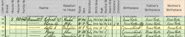 At 24 years old, Flora was plenty old enough to be married in 1875. Plus, both Robert and Flora were from New York State. So, they could have gotten married there before they set out for Danbury, Connecticut in 1874. If the had done so, they would have been married for 26 years in the year1900, that would have been enough time to have a baby in 1875. However, Flora said she was married for 22 years, so …this means they were married 22 years by August of 1900 (August is when the 1900 census came out) and Maltby, who was born on September 15, 1875 was about to turn 3 years old when she married Robert Barrett. If true, that’s pretty colorful stuff!